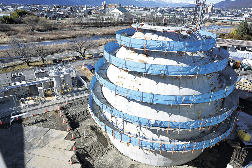 松本市両島の下水処理場・市両島浄化センターの敷地に、卵形の巨大な建物が建設されている。卵形消化槽と呼ばれる地上高16・3メートル、最大内径16メートル(容量2700立方メートル)のタンクとなる。近く足場が取り払われる見通しで、コンクリートで覆われた構造物がひときわ目を引きそうだ。卵形消化槽の建設は、国内では約10年ぶりという。
