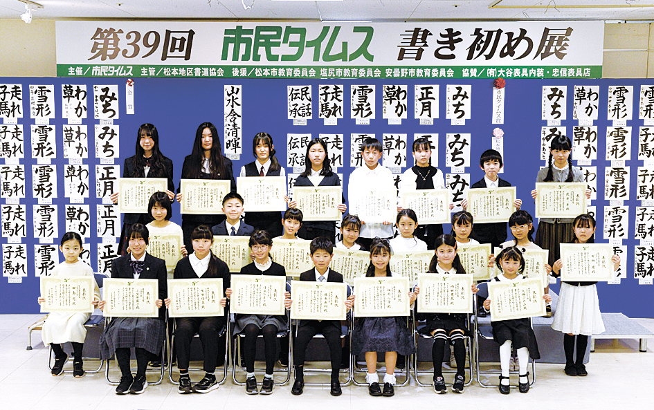 第39回市民タイムス書き初め展(市民タイムス主催、松本地区書道協会主管)の表彰式が1日、山形村の大型商業施設・井上アイシティ21で行われた。最高賞の市民タイムス賞の7人と最高賞に次ぐ松本地区書道協会賞の20人を表彰し、みずみずしい作品と、書に取り組む日頃の頑張りをたたえた。