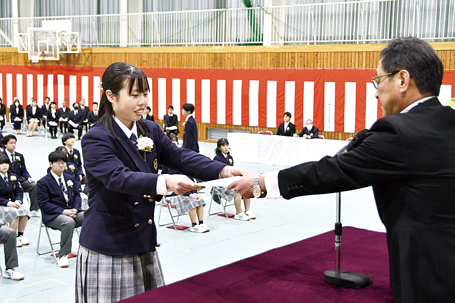 村松義晴校長は式辞で、探究学習や生徒会活動などを通し、問いを立てて対話を重ね考え続ける姿勢を見つけた3年生をたたえた。「蘇南での学びは人生を支える力になる。自分らしく誠実に、それぞれの場所で歩んでいって」と激励した。
