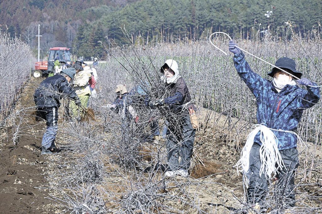 村役場近くの農地で2月20日に今年最初の収穫が行われ、トラクターで根を起こした高さ約1.8メートルの苗木を、従業員らが手早く抜いてひもで縛って束ねていた。