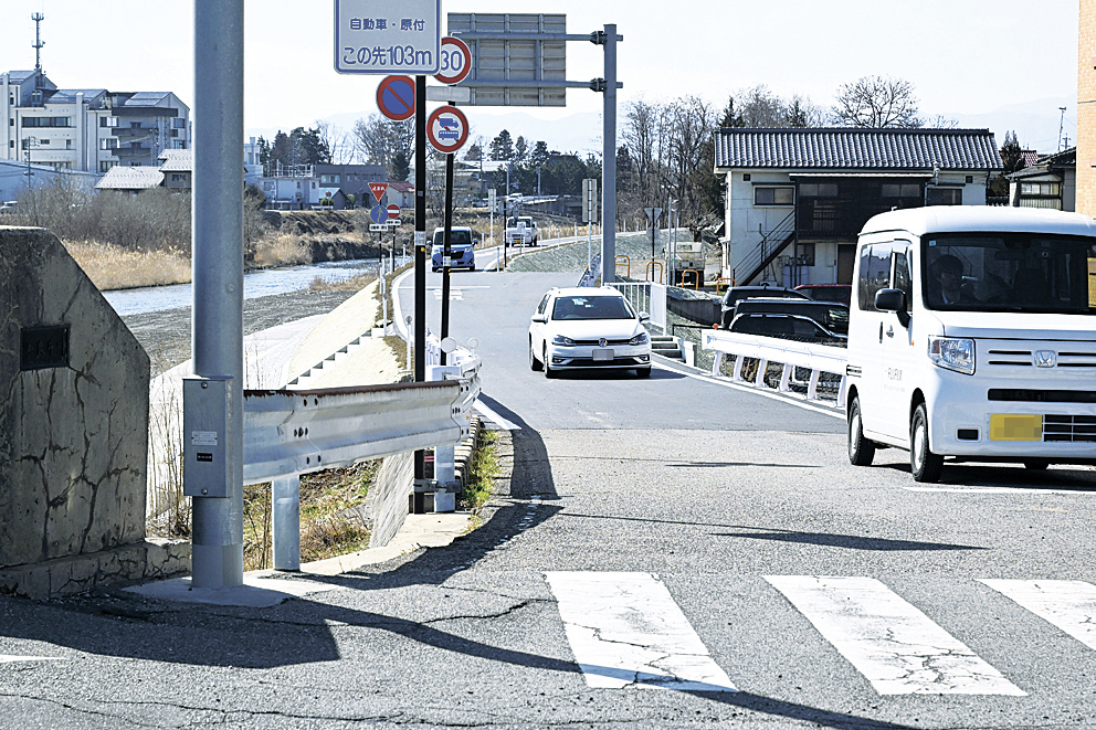 松本市島立の奈良井川左岸堤防道路で、通行止めとなっていた奈良井大橋―松島橋間が9日朝に開通した。松島橋近くで進められていた護岸工事が終了したため。