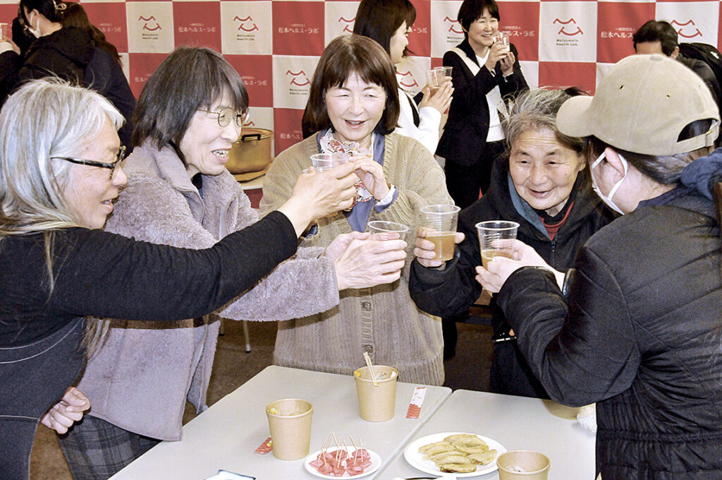 試飲パーティーではノンアルコールのビールやカクテルなどが提供された。松本おかみさん会が協力した松本一本ねぎ焼き、わさびコロッケなど松本ならではの料理も堪能しながら、にぎやかに感想を語り合った。