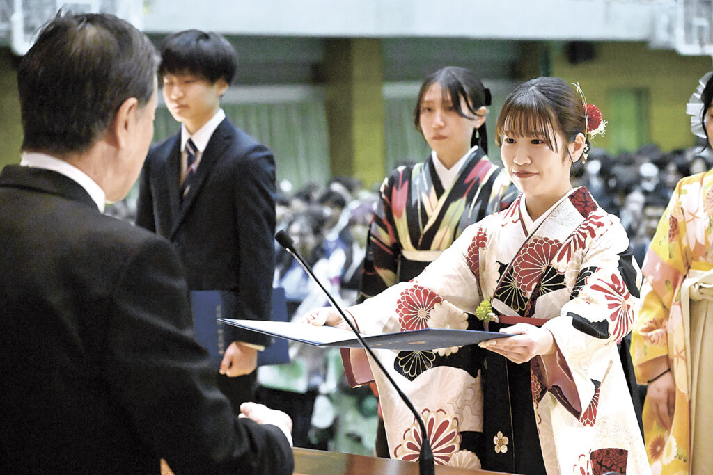 学科や課程の総代計9人が登壇し、清水一彦学長から学位記を受け取った。清水学長は告辞で、卒業生と修了生には課題探求能力と就業力、社会人基礎力が身に付いているとし、「幸せな人生をもたらすだけでなく、地域やグローバル社会の問題や課題を解決していく原動力にもなるはず」と激励した。