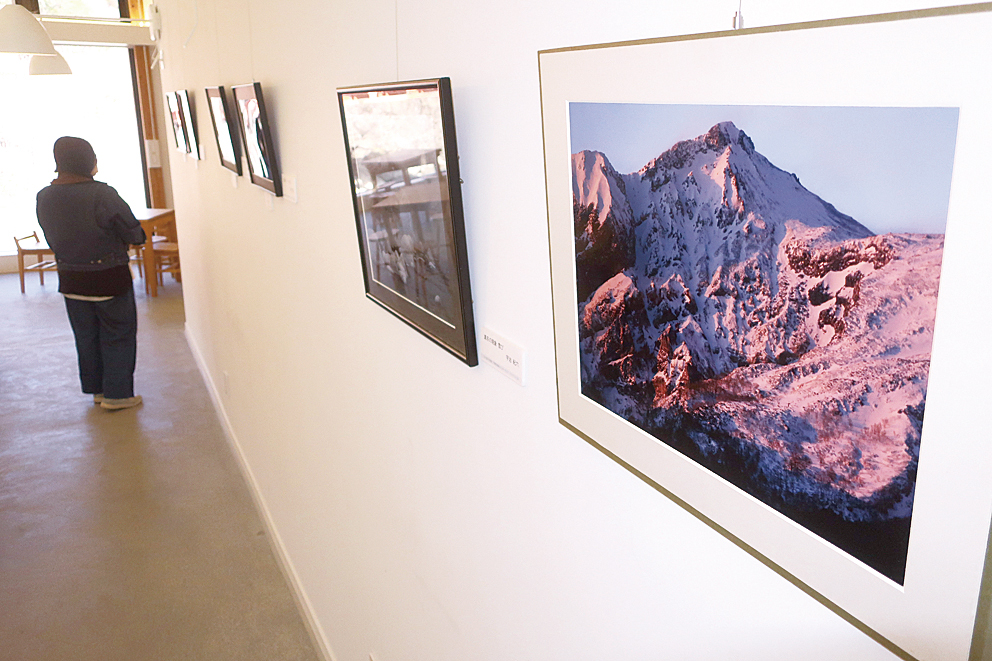 氷と雪の写真展は、木曽地域を中心に応募があった計13作品を展示。御嶽山麓で見つけたアジサイのような形の氷、冬の開田高原の雪面に差す光と影など、それぞれの感性で冬の木曽の美しさを捉えた作品が並ぶ。