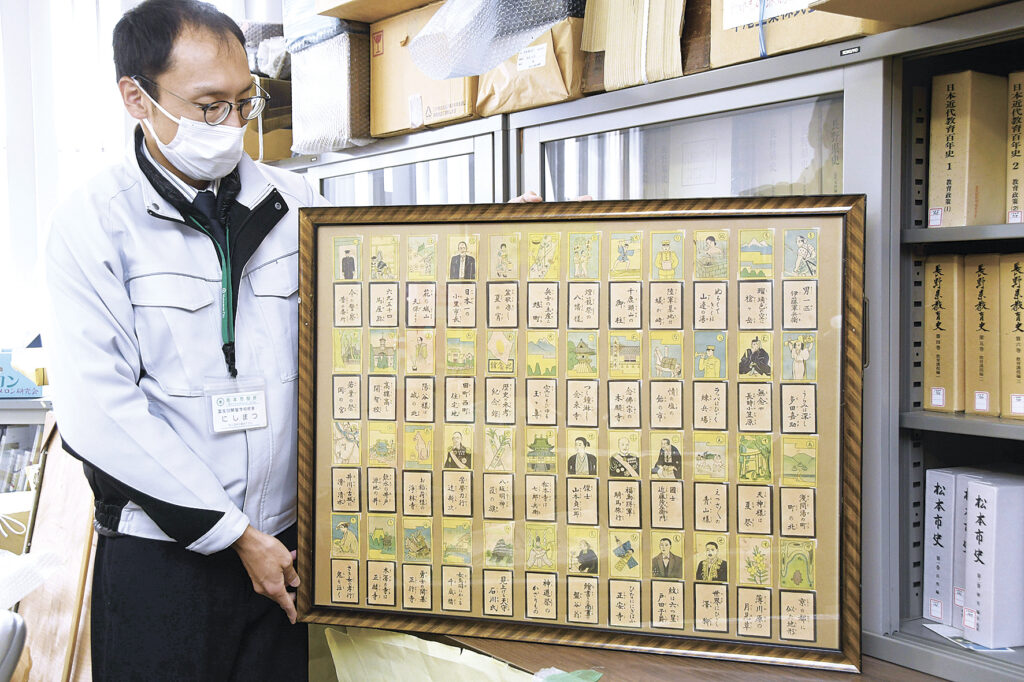 国宝旧開智学校校舎の学芸員・西松秀記さん(38)が、隣接する中央図書館内にある旧開智学校研究室で見つけた。紙に包まれた形で置いてあり、松本郷土かるたと書いたラベルが貼ってあった。