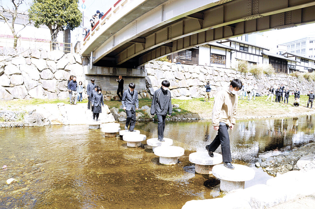 松本市の中心街を流れる女鳥羽川で、水辺環境の整備に取り組む有志団体「Metoba(メトバ)リバーサイドプロジェクト」は23日、女鳥羽川に架かる「中の橋」の下に設置した飛び石の渡り初めを行った。設置に協力したエクセラン高校の生徒とプロジェクトメンバー、事業主体の県松本建設事務所、松本市の職員ら約30人が参加し、記念撮影をして完成を祝った。飛び石を活用することで水に親しむ空間を創出し、街なかの活性化を図る。